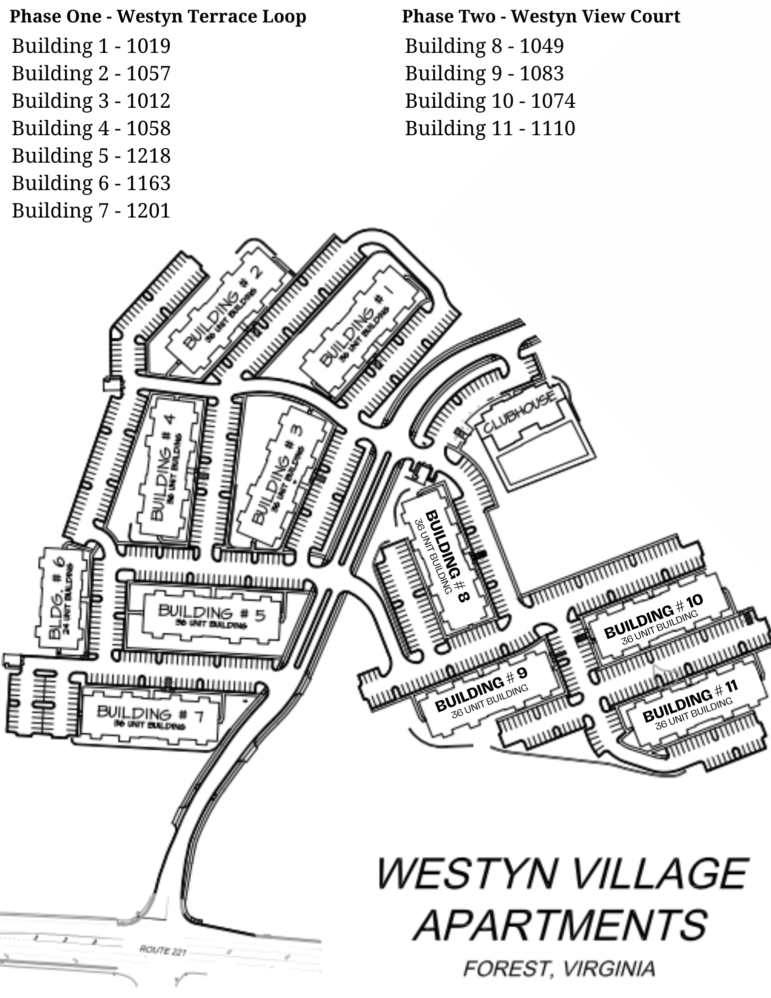Westyn Village site mapPlease meet the Property Manager at the entrance of the building listed on the appointment booking page.